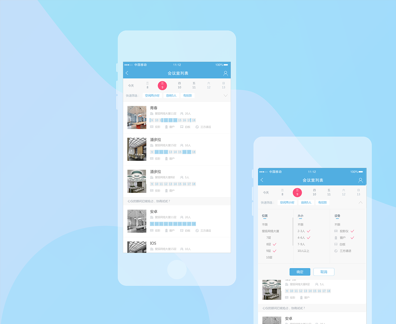 会议室状态一目了然,完美解决会议时间冲突和空间浪费问题。双重查询方式:查询某个时间段的空闲会议室,查询某个会议室的空闲时间段;